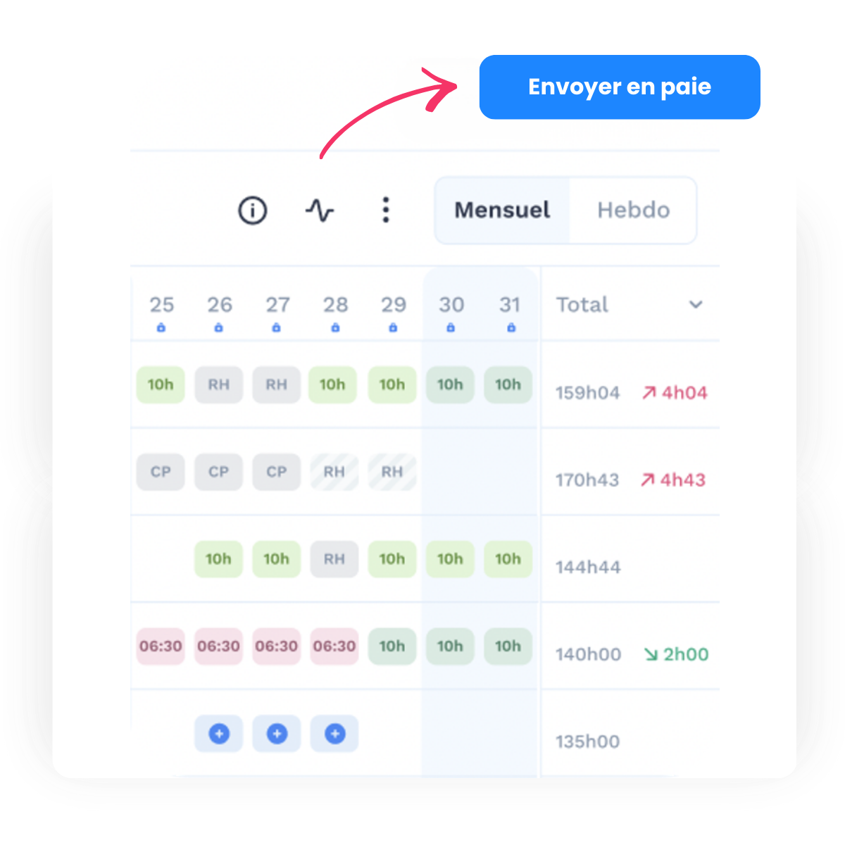 Exportez des fichiers personnalisés pour un envoi en paie adapté à vos processus internes. Les données se synchronisent instantanément et garantissent des informations fiables au moment d’éditer les bulletins.